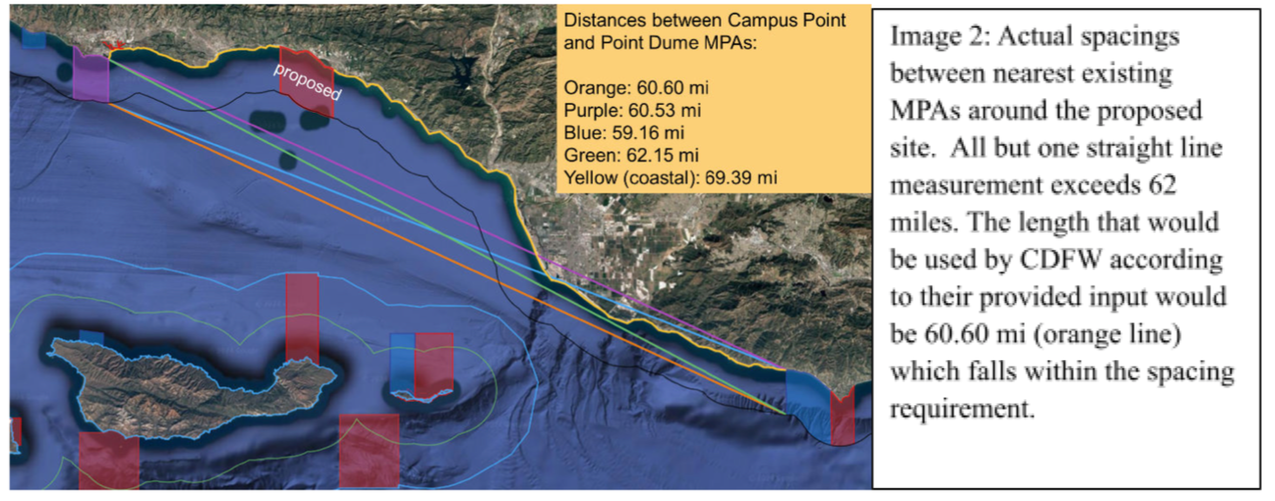 Discussions with the CDFW clarified that MPA spacing is measured by the, “shortest distance over water between two MPAs.” When measuring the distance between Campus Point and Point Dume, we find that it is in fact less than 62 miles, indicating that the current spacing distribution is adequate along the coast (see below Image 2).